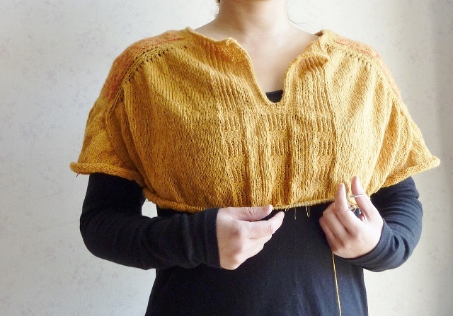 つまり、肩の部分に来る編み込み模様は、往復編みで編まねばなりません(うっ・・・)。